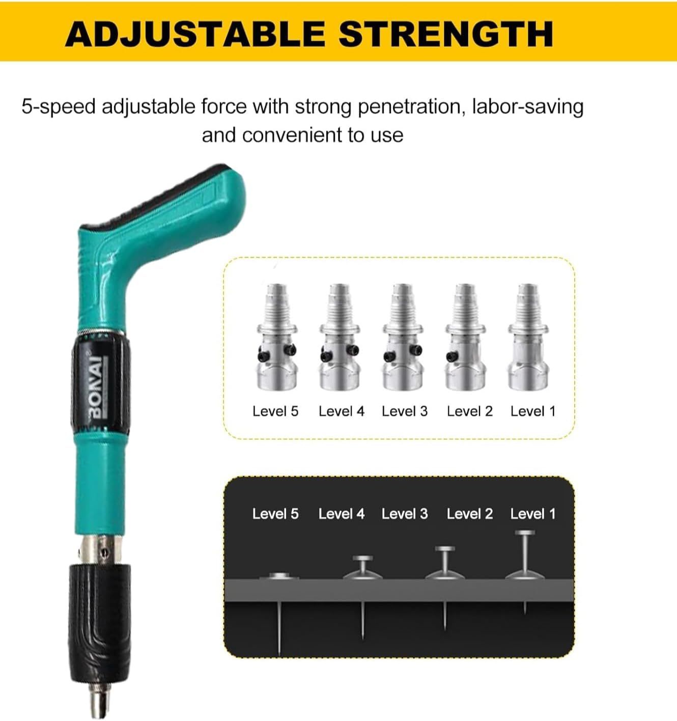 - Introducing our cutting-edge Adjustable Strength Nail Gun, a game-changer in the world of home improvement! With 5-speed adjustable force, experience unparalleled convenience and labor-saving efficiency for all your nailing needs.